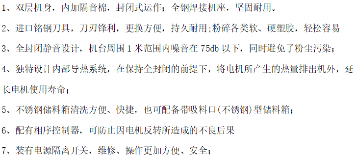 描述:静音型粉碎机顾名思义就是双层隔音低噪音破碎机,在原本普通粉碎机的基础上加装一层隔音材料,将整台机器加了一层钣金包围了起来,从而降低粉碎产生的噪音,而非完全静音,相比之下静音型环保破碎机比传统普通粉碎机的噪音会小一点点,大概音贝在85dB的样子。