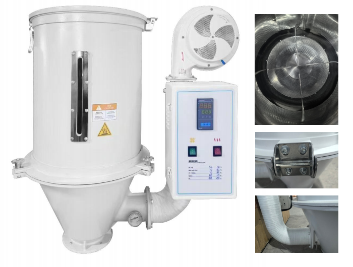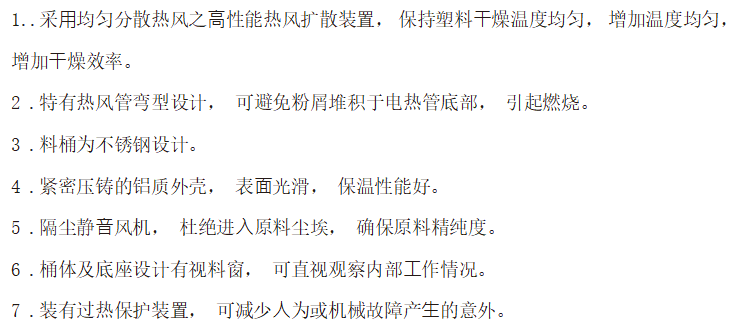 描述:此款干燥机是一种用于去除塑料原料颗粒中水分的设备,广泛应用于塑料制品加工行业。其主要功能是通过加热和空气流动来干燥塑料颗粒,以确保在加工过程中不会因为水分的存在而导致产品质量问题。整体材料使用不锈钢材质,硬度高,有效抗腐蚀、抗老化,避免因锈蚀造成的原料污染,有效的增加使用寿命。