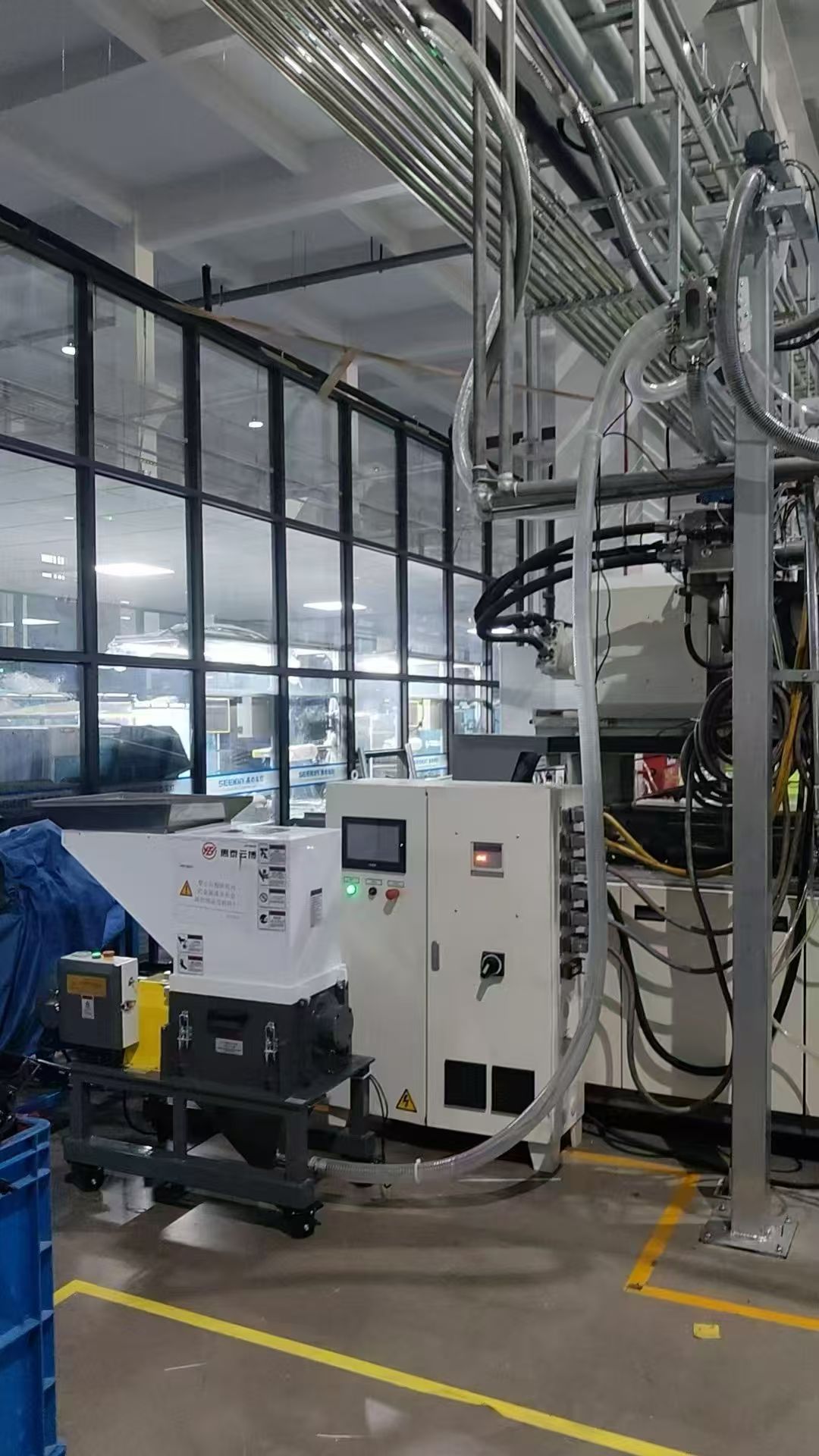 车灯水口料硬度高、对温度敏感,优先选用低速高扭矩静音粉碎机,转速控制在 400rpm 以内,减少摩擦发热,避免 PC/PMMA 发黄、降解;刀型选用剪切式刀片,破碎均匀、粉尘少;机边机型可实现即时产生、即时粉碎、即时回用,减少转运损耗与占地;集中破碎线适配多机台集中回收,效率更高、管理更规范。